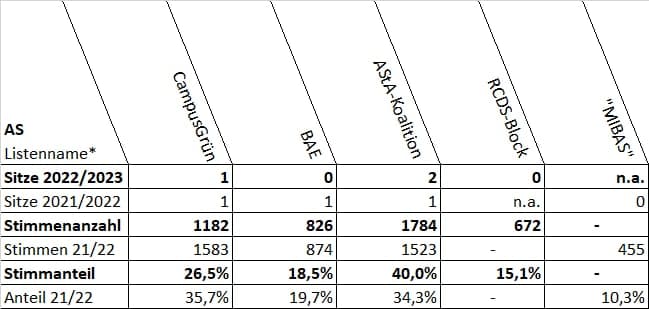 Der konservative Block verliert nominell leicht, aber dessen Machtposition hängt sowieso nicht von der Fraktionsstärke ab, sondern von der Funktion des Parlamentspräsidenten als Brandmauer gegen die reformistische Kritik des BAE, die bei den in politischer Irrelevanz um sich selbst kreisenden AStA-Akteur*innen vor allem als zeitliche und nervliche Belastung ankommt. Bei den Wahlen hat er dafür mal wieder ganze Arbeit geleistet: Mit der Verzögerung und dann scheibchenweisen Verlängerung der Briefwahl, der Abschaffung fast aller Urnen bei der Präsenzwahl und verschiedenen kleineren Mätzchen hat das Ausmaß an Einschränkungen formaldemokratischer Rechte und präsidialer Willkür neue Dimensionen erreicht.