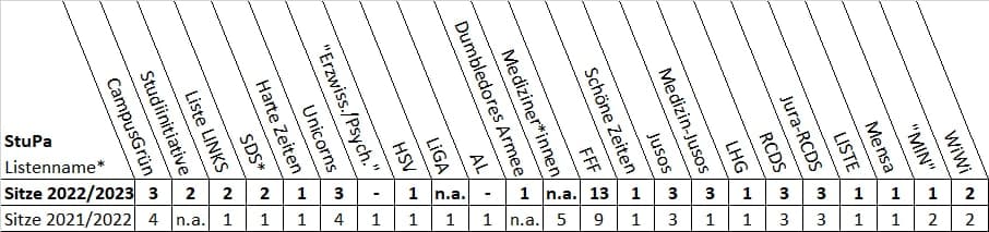 Innerhalb der linken Listen gibt es ansonsten kleinere Verschiebungen: Das linkssozialdemokratische BAE verliert im AS (-1 Sitz), gewinnt aber im StuPa (+2 Sitze), die postautonomen Unicorns verlieren inklusive Tarn- und assoziierten Listen 1-2 Sitze (Zugehörigkeit von „Dumbledores Armee“ unklar), die nach 2 Jahren Pause wieder angetretene bewegungsnah-leninistische „Studierendeninitiative“ erringt 2 Sitze.