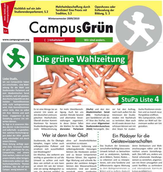 wir von CampusGrün haben uns entschieden, eine Wahlzeitung für die Wahl zum Studierendenparlament und zum Akademinschen Senat zu machen, weil wir glauben, dass Hochschulpolitik von den meisten KommilitonInnen nicht recht wahrgenommen wird. Viele KommilitonInnen sehen nicht, dass sie selbst mit ihrer Stimme und auch ihrem Engagement an der Gestaltung unserer Uni mitwirken können.