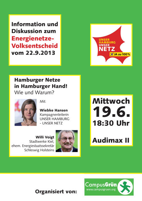 CampusGrün lädt ein zu Information und Diskussion über die Machbarkeit und Chancen einer Netzübernahme in Hamburg.