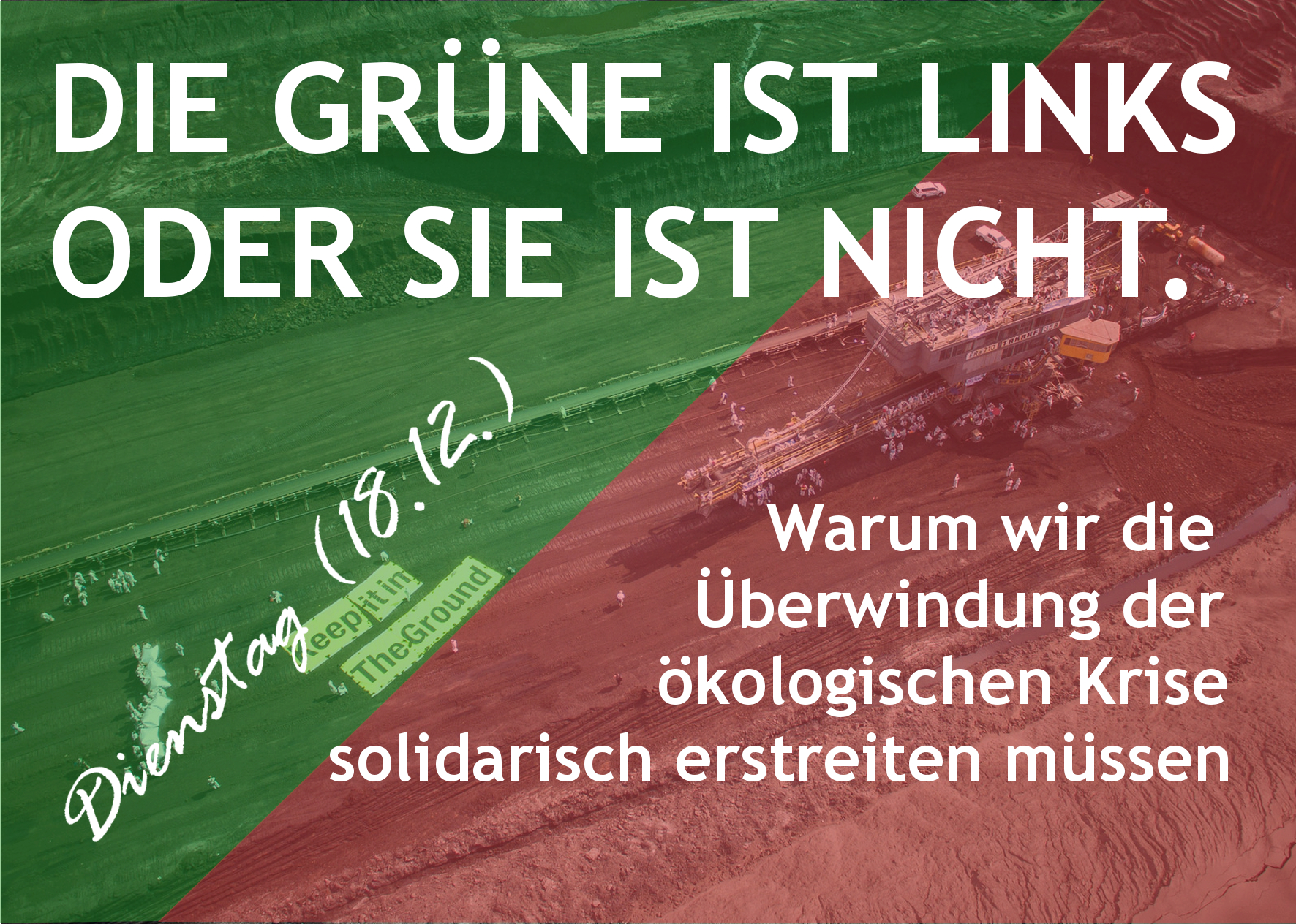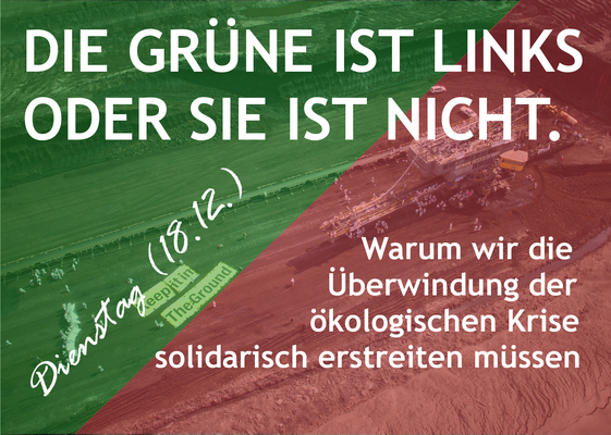 Grundlage der Diskussionsveranstaltung ist für uns, dass ein breites Problembewusstsein um die fortschreitende Naturzerstörung sowie der Wille, Verantwortung zu übernehmen, um diese aufzuhalten, bereits verbreitet vorhanden sind. Hinzuwirken ist daher vor allem auf die Erkenntnis, dass tatsächlich die aktuelle Organisationsform gesellschaftlichen Lebens ursächlich für die oben besprochenen Probleme ist. Wir wollen raus aus einem subjektivierten Nachhaltigkeitsbegriff, und diesen stattdessen antikapitalistisch erneuern!